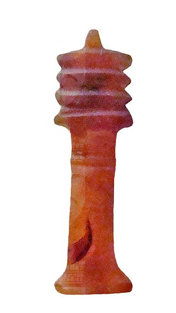 Amuleto in corniola, privo di foro di sospensione, che raffigura il geroglifico "djed", a forma di pilastro con quattro espansioni nella parte superiore, che indica stabilità, immutabilità, eternità, resurrezione, ma anche forza inestinguibile ed incorruttibilità. Già nella Prima Dinastia (3150 – 2925 a.C.) era un pilastro intorno al quale venivano legate spighe di grano; dal Nuovo Regno (1543 – 1078 a.C.) fu interpretato anche come spina dorsale di Osiride. Un djed, meglio se in oro, era posto sulla gola del defunto durante il suo funerale, con il compito di farlo divenire uno spirito santificato e perfetto, un seguace di Osiride. Nel capitolo 155 del Libro dei Morti l’amuleto fa sì che “è tua nuovamente la tua spina dorsale e le tue vertebre, così che puoi tornare a muoverti...”.