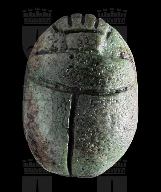 Scarabeo in faience turchese con sul ventre incisione che rappresenta una triade divina su un segno neb. Il dio centrale ha la corona di Ammone e quello di destra il disco solare sul capo.Il dorso presenta clipeo, protorace ed elitre separati da incisione a T. Foro passante longitudinale.