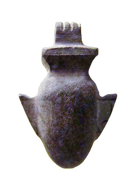 Amuleto in pietra lavorato a tutto tondo, con presa non forata nella parte superiore. Raffigura il geroglifico "ib", vale a dire il "cuore", con la massa ovoide centrale e le terminazioni dei tre vasi sanguigni (due sui lati e una in alto); vista l'importanza di quest'organo nel giudizio dei defunti nell'aldilà, un tale amuleto veniva posto tra le bende delle mummie per evitare che il vero cuore venisse rapito.