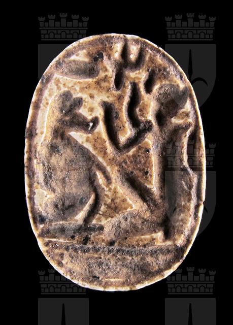 Scarabeo in steatite grigia con sul ventre una rappresentazione del faraone inginocchiato in atto di adorazione davanti al dio Thot in forma di babbuino. Sopra di essi dei segni geroglifici non leggibili, probabilmente il nome del sovrano. Dorso con clipeo sulla testa e incisione a T che separa il protorace dalle elitre, sulle quali sono incise tacche a V; in basso è visibile lo scutello. Foro passante longitudinale.