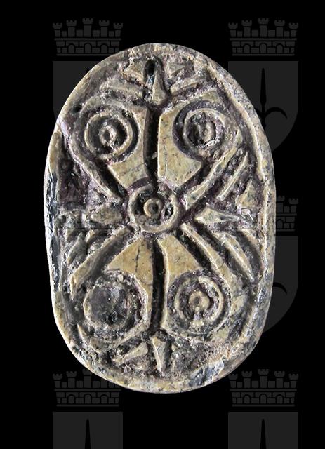 Scarabeo in steatite grigia, con sul ventre incisione di motivo geometrico con schema a croce, alle cui estremità vi sono dei fiori di loto. Sul dorso è segnata solo la testa con il clipeo. Foro passante longitudinale.