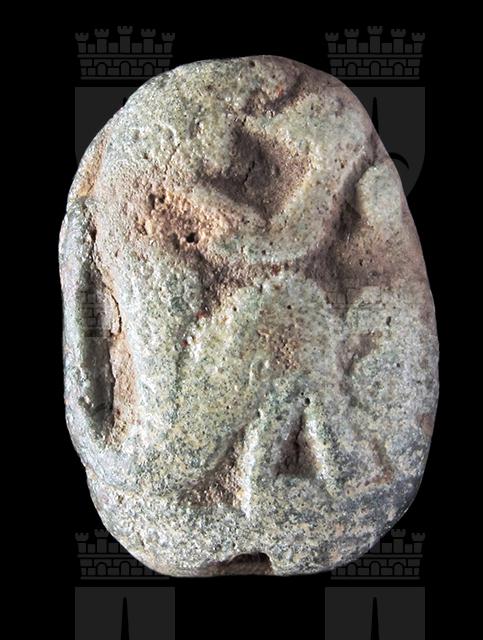 Scaraboide in faience con sul ventre rappresentazione di divinità con disco solare e piuma. Dorso con incisione di una scimmia che suona uno strumento a fiato, con un elemento decorativo vegetale davanti (capovolto rispetto alla decorazione del ventre). Il colore originale doveva essere azzurro. Foro passante longitudinale.