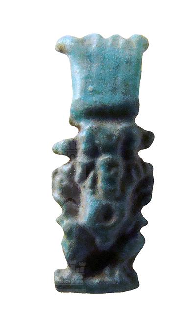 Amuleto in faience raffigurante la divinità apotropaica Bes. Il dio è raffigurato nel suo aspetto consueto: con il corpo tozzo e le gambe arcuate, le braccia appoggiate sulle cosce, il volto frontale con le orecchie sporgenti, le sopracciglia evidenziate, la barba e il grande naso piatto. Sul capo porta una corona di piume di struzzo, mentre i piedi poggiano su una piccola base quadrangolare. Presenta un foro passante all'altezza della corona.