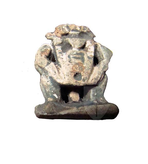 Amuleto in faience raffigurante la divinità apotropaica Bes, del tipo bifronte, vale a dire che l'immagine frontale del dio compare su entrambe le facce dell'amuleto. Il dio è raffigurato nel suo aspetto consueto: con il corpo tozzo e le gambe arcuate, le braccia appoggiate sulle cosce, il volto frontale con le orecchie sporgenti, le sopracciglia evidenziate, la barba e il grande naso piatto. Manca la corona di piume di struzzo, che però in origine era presente, mentre i piedi poggiano su una piccola base quadrangolare.