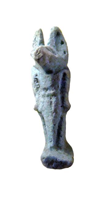 Amuleto in faience raffigurante il dio Anubi. Il dio dalla testa di sciacallo è raffigurato in piedi, nell’atto di camminare (con la gamba destra in avanti) e con le braccia stese lungo i fianchi; le mani sono chiuse a pugno. Le orecchie sono molto evidenti, così come il muso canino allungato. Indossa un corto gonnellino pieghettato. Data la minutezza della figura, i piedi poggiano su una piccola base parallelepipeda, mentre sul retro vi è il pilastro dorsale, che presenta un foro passante.