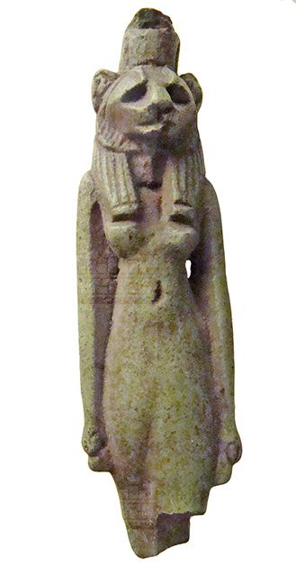 Amuleto frammentario in steatite che raffigura la dea Sekhmet. L’iconografia è quella consueta, di donna con testa di leonessa. La dea è raffigurata stante, con le braccia lungo il corpo. Sul capo sembra avere la doppia corona dell'Alto e Basso Egitto, molto stilizzata. L'amuleto è spezzato all'altezza delle ginocchia.