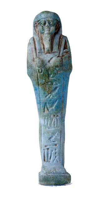 Statuina funeraria mummiforme che indossa parrucca tripartita e barba divina intrecciata. Le mani incrociate, la destra sopra la sinistra, portano rispettivamente una zappa e un piccone. Dalla spalla sinistra pende una sacca. Il pilastro dorsale e la base sono presenti. L’iscrizione è disposta in una colonna sul davanti delle gambe.