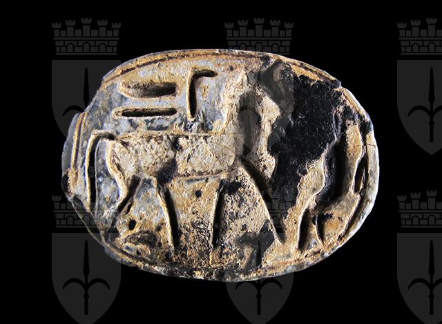 Scarabeo in steatite grigia con sul ventre la rappresentazione di un cavallo davanti al quale vi è forse una nebride (pelle animale appesa ad un bastone: è uno dei simboli di Osiride). In alto vi sono dei segni geroglifici di lettura incerta. Dorso con clipeo e doppia incisione a T che separa protorace dalle elitre, visibili le zampe ripiegate lateralmente. Foro passante longitudinale.