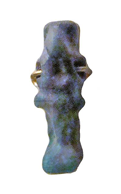 Amuleto in faience che raffigura il dio Thot, dio della sapienza e inventore dei geroglifici. In modo più che schematico, il dio è raffigurato in piedi, nell'atto di camminare (ha la gamba sinistra in avanti); la testa è quella dell'ibis, suo animale sacro, caratterizzata dal lungo becco a forma di falce lunare (non particolarmente accentuato), con una parrucca che scende sul petto; le braccia sono stese lungo il corpo, con le mani chiuse a pugno; indossa un corto gonnellino. I piedi poggiano su una base parallelepideda, che dietro si sviluppa nel pilastro dorsale. C'è un foro passante ricavato all'altezza delle spalle.