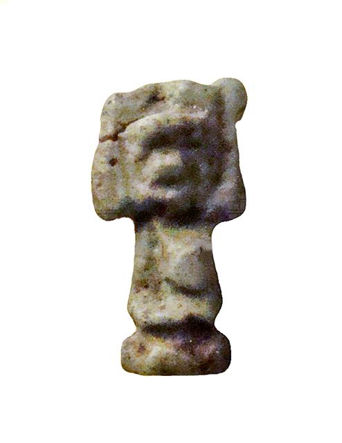 Amuleto in faience, alquanto stilizzato, raffigurante il dio dell'aria Shu. Il dio è raffigurato inginocchiato, con indosso un gonnellino e con le braccia alzate simmetricamente a reggere un disco solare sopra il capo. I piedi poggiano su una piccola base parallelepipeda, che dietro si sviluppa nel pilastro dorsale, forato per permettere la sospensione dell'amuleto.