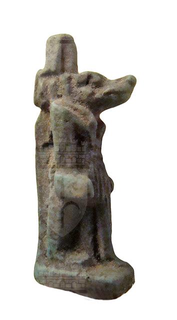 Amuleto in faience raffigurante il dio Anubi. Il dio dalla testa di sciacallo è raffigurato in piedi, nell’atto di camminare (con la gamba destra in avanti) e con le braccia stese lungo i fianchi; le mani sono chiuse a pugno. Le orecchie sono molto evidenti, così come il muso canino allungato. Indossa un corto gonnellino pieghettato. Data la minutezza della figura, i piedi poggiano su una piccola base parallelepipeda, mentre sul retro vi è il pilastro dorsale, che presenta un foro passante.