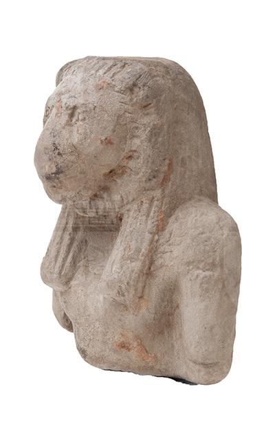 Parte superiore di una statuina in arenaria che raffigura la dea Sekhmet, corrispondente al busto e spezzata sotto il seno. L’iconografia è quella consueta, di donna con testa di leonessa. Il muso felino è modellato con cura, per quanto si può vedere, e la parrucca tripartita è segnata da linee verticali parallele. Non si distinguono altri dettagli.