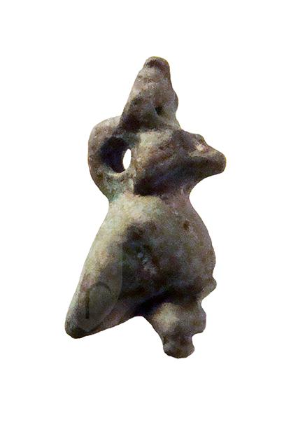 Amuleto in faience lavorato a tutto tondo, raffigurante il dio Horus in forma di falco, con in capo la corona atef e le zampe che probabilmente poggiavano su una piccola base, ora perduta. Dietro la testa è presente un anello di sospensione.