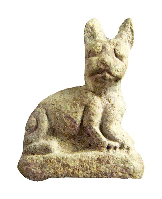 Amuleto in faience lavorato a tutto tondo, raffigurante un gatto dalle grandi orecchie seduto su una piccola base; la testa del gatto è girata verso destra; all'altezza del collo vi è un foro passante.