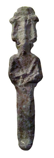 Amuleto in bronzo raffigurante il dio Osiride, dalla superficie molto consunta e dal modellato piatto. Secondo la consueta iconografia, il dio è raffigurato stante, con il corpo mummiforme da cui escono solo le mani, che reggono scettro e flagello, e la testa, sulla quale vi è la corona atef. Al mento vi è la solita barba divina posticcia. Sotto i piedi vi è un perno, attualmente spezzato.