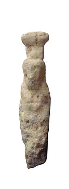 Amuleto in faience, privo dello strato lucido superficiale originale, che raffigura la dea Nefti. Sul capo ha il geroglifico del suo nome, sopra la parrucca che scende sulle spalle; le braccia sono stese lungo il corpo, mentre le gambe sono dritte, la sinistra avanzata rispetto alla destra, come se la dea stesse camminando; purtroppo l'amuleto è spezzato all'altezza delle ginocchia.