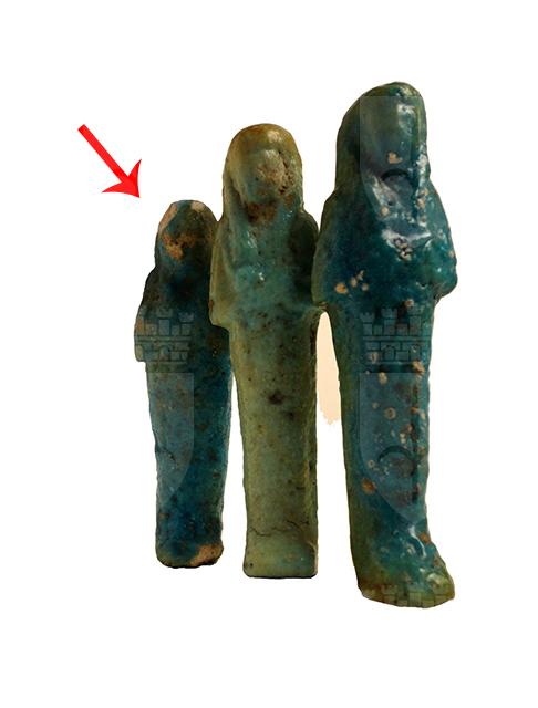 Statuina funeraria mummiforme che indossa una gonfia parrucca tripartita. Le braccia sono incrociate e reggono attrezzi non identificabili; pilastro dorsale e base sono assenti. L’ushabti è privo di iscrizioni.