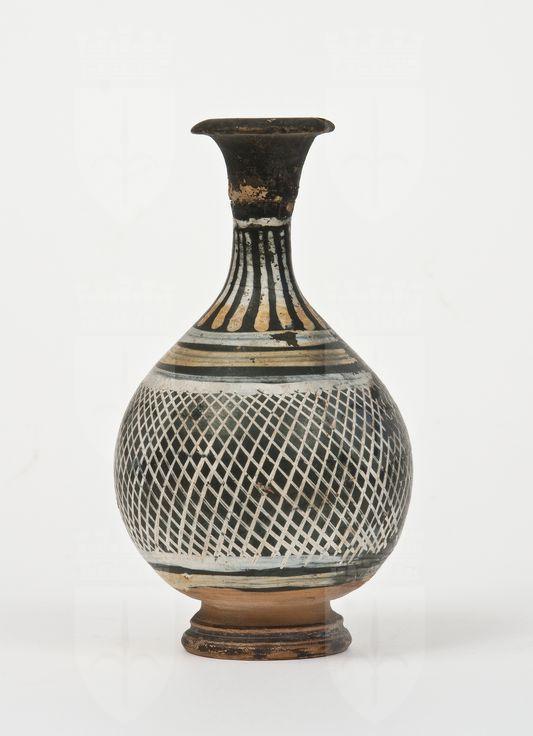 Bombylios o unguentario a bottiglia a vernice nera lucente con sovraddipinture in bianco e giallo. Bocchello campanulato, stretto collo a profilo concavo, corpo globulare, quasi sferico, bassa gola di raccordo, piede troncoconico con taglio modanato, fondo apicato. Sul collo tra una sottile linea e una fascia, dipinte in bianco, bastoncelli verticali, in bianco e, nella parte terminale, in giallo. Sulla spalla fascia in giallo; sul corpo motivo a reticolo con maglie romboidali sovraddipinto in bianco, inquadrato superiormente e inferiormente da linee dello stesso colore. Alla base della pancia, infine, fascia irregolare dipinta in bianco.