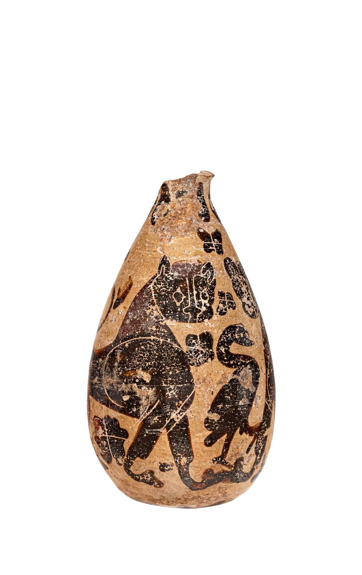 Alabastron piriforme con due pantere affrontate e in mezzo cigno ad ali abbassate; nel campo rosette con ritocchi di colore rosso.