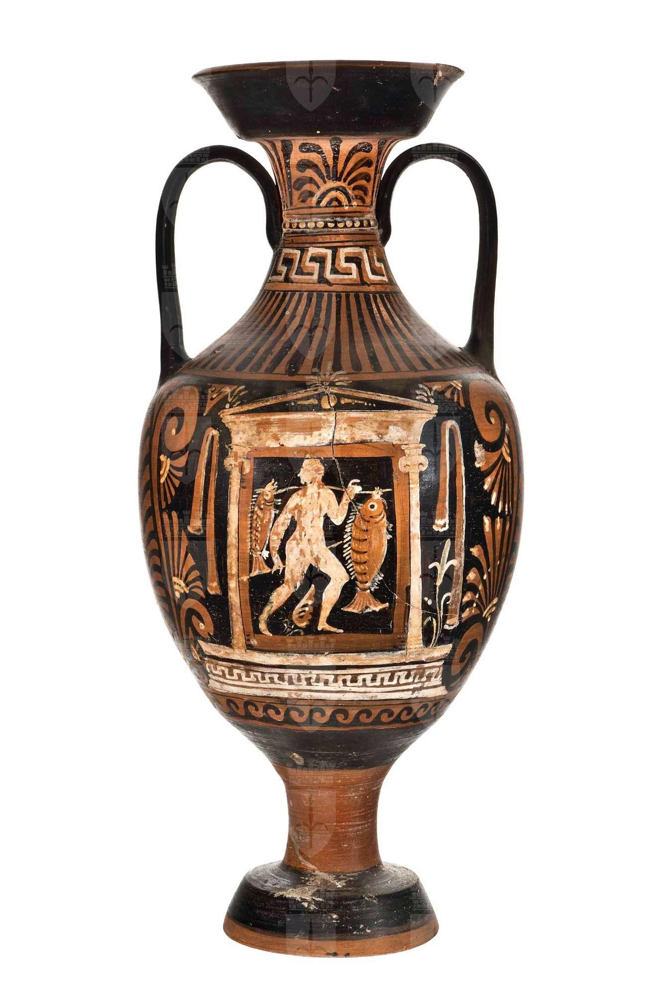 Anfora panatenaica apula a figure rosse. Lato A: raffigurazione del defunto eroicizzato all'interno di un'edicola con pesci appesi su un'asta appoggiata alla spalla. Lato B: testa femminile.