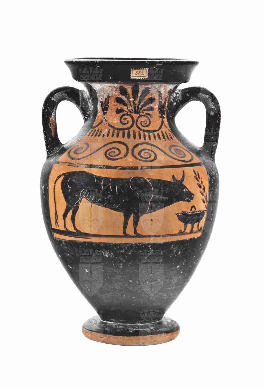 La forma dell'anfora è affine a quella delle anfore campaniformi attiche di tipo B; l'orlo è svasato e modanato, e si attesta su un corto collo cilindrico, dal profilo convesso. Le anse a bastoncello si impostano verticalmente tra il collo e la spalla, poco rilevata, e il corpo ovoide, molto rastremato verso il fondo, poggia su un piede ad echino rovesciato semplice. La vernice nera, piuttosto lucida, è uniforme e copre tutta la superficie del vaso, compreso l'interno del collo, fatta eccezione per i due spazi decorati e una fascia risparmiata alla base del piede; alcuni dettagli della decorazione secondaria presentano inoltre sovradipinture rosse. Il colore dell'argilla è Munsell 7.5YR 5/4 (brown). La decorazione principale del lato A presenta, in un riquadro, limitato in alto da una linea nera, un bovino, fermo e perfettamente di profilo, ma con le gambe in posizione sfalsata, tutte perfettamente visibili; le corna sono a mezzaluna, mentre la lunga coda è biforcuta. Sono rappresentati anche i dettagli della muscolatura, del costato e dei genitali. A destra della scena troviamo un louterion, con una presa centrale in alto e l'orlo decorato, e un ramo d'ulivo, che spunta la bordo destro del riquadro; una linea nera fa da appoggio al motivo figurato. Il lato B presenta un semplice fregio vegetale limitato da due linee nere, composto da tre palmette, una delle quali sborda dal riquadro risparmiato, intervallate da coppie di boccioli di loto; dai boccioli si dipartono due tralci a spirale, che si incontrano alla base delle palmette andando a costituire delle volute. La decorazione accessoria su spalla e collo è pressoché simmetrica sui due lati del vaso, con un motivo a doppia spirale contrapposta sulla spalla, arricchito da un punto rosso al centro delle spirali (meno accurato sul lato B, poiché una della spirali sborda dal riquadro riservato alla decorazione), limitato alla base del collo da una sequenza di linguette nere. Sul collo troviamo nuovamente il motivo a palmette e boccioli di loto, analogo a quello presente sul riquadro del lato B, con una palmetta centrale con volute affiancata dai boccioli. Sull'orlo, sul lato A, è presente una vecchia etichetta, recante un precedente numero di inventario ('852').