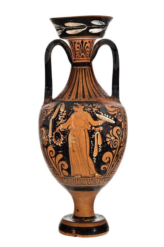 Anfora panatenaica a figure rosse con elementi sovradipinti in bianco e giallo. Alto labbro svasato; collo stretto; breve spalla arrotondata; corpo ovale; alto stelo su ampio piede troncoconico; anse a nastro impostate fra il centro del collo e la spalla. Sul labbro ramo d'alloro; palmette sovrapposte fra girali con foglie; inferiormente meandro interrotto da rettangoli con croce e puntini. Lato A: defunta in chitone seduta su roccia all'interno di un'edicola con specchio in mano. Lato B: scena di offerta: donna stante con phiale e serto a corona.