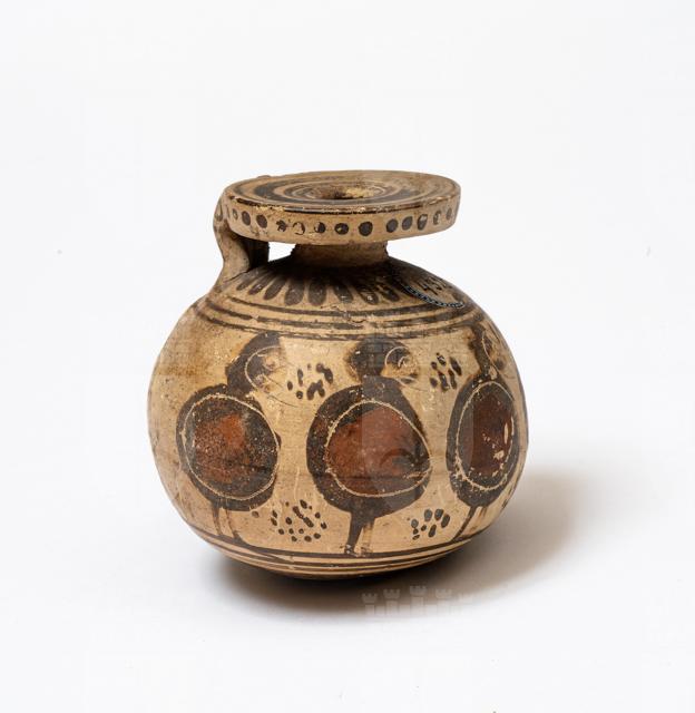 Aryballos corinzio a corpo espanso con tracce di ornamenti e figure rosso-brune. Tre figure barbute (comasti) in atto di danzare in mezzo a fiori e foglie. Il fondo è ornato da una stella.
