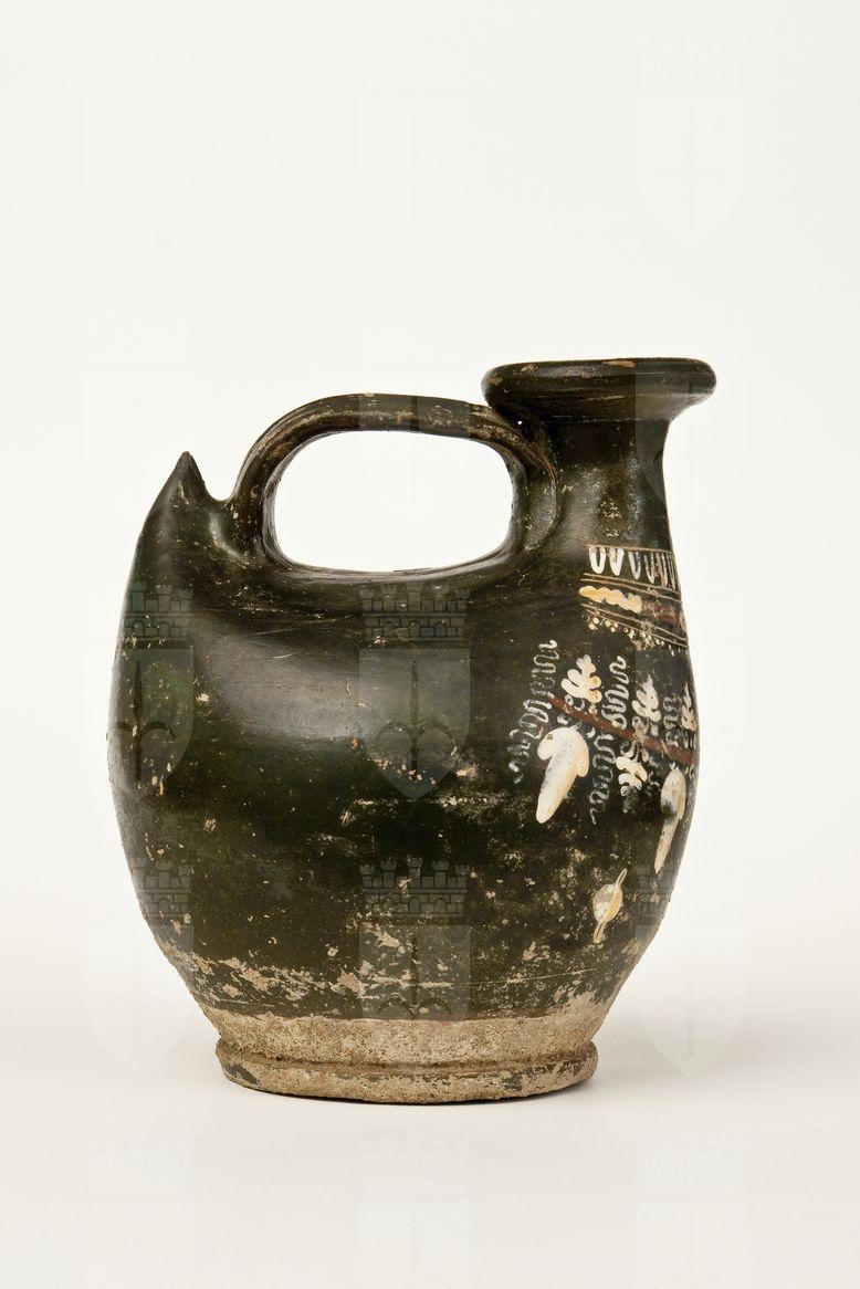 Askos con palla di lana e coppa a vernice nera con sovraddipinture in bianco, giallo, ocra e rosso amaranto ed incisioni. Orlo rigonfio leggermente introflesso, collo cilindrico a profilo concavo, corpo globulare schiacciato, ansa a nastro orizzontale impostata longitudinalmente sulla parte superiore del corpo e saldata al collo, basso piede ad anello. Sul collo: tra una linea incisa e due coppie di linee incise, sequenza di ovuli dipinti in bianco crema e tremuli giallo-rossi, seguiti da gruppi di tre punti. Sul corpo: tralcio di vite con stelo in rosso amaranto, grappoli, pampini, viticci e una rosetta con bottone centrale e petali a cerchio.
