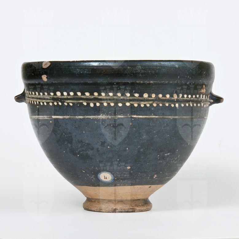 Bacino a vernice nera lucente con sovraddipintura in bianco crema e giallo. Orlo rigonfio leggermente introflesso, corpo emisferico, anse ad orecchie modanate, piede ad anello. Sotto l’orlo, ramo secco orizzontale con stelo dipinto, reso con una doppia linea e foglie puntiformi in giallo su base bianca. Segue sotto il ramo secco, per tutti e due i lati, linea incisa e campita in bianco crema. Risparmiati una fascia alla base della vasca ed il fondo del piede; sul fondo del piede nonostante le incrostazioni si intravedono tracce di miltos.
