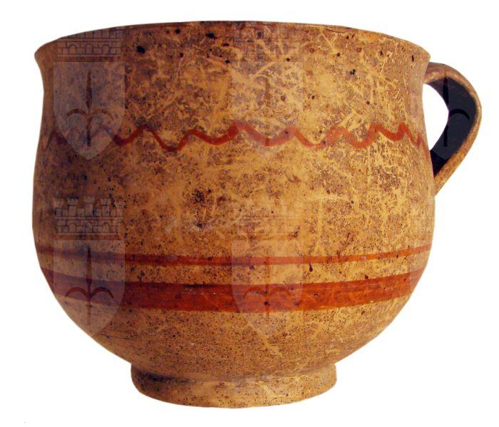boccale con corpo a sacco con labbro leggermente aggettante, ansa a nastro verticale non sormontante, piede troncoconico. Decorazione in rosso con sottili fasce concentriche in corrispondenza della circonferenza massima e motivo a tremolo sulla spalla.