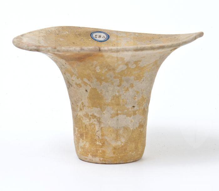 Kalathos in ceramica messapica. Corpo rastremato a profilo concavo, labbro estroflesso arrotondato, bocca molto espansa, base piana, privo di decorazione.