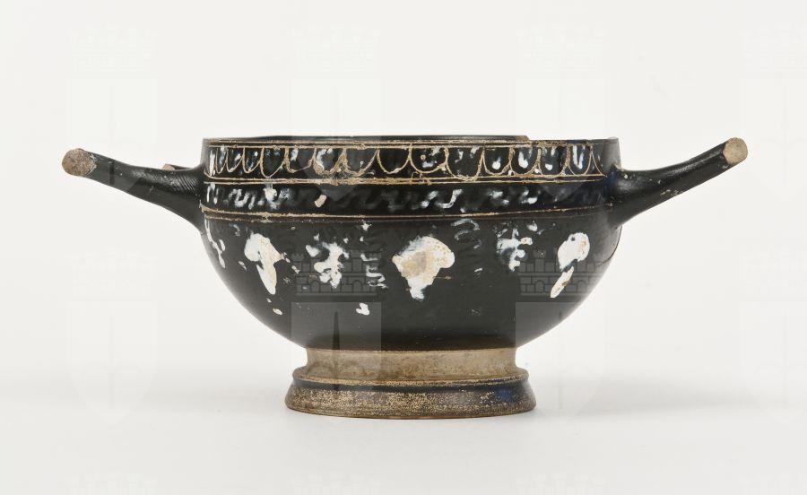 Cup skyphos a vernice nera lucente con sovraddipinture in bianco, giallo e incisioni. Orlo leggermente estroflesso, vasca emisferica, anse a bastoncello (sormontanti l'orlo), gola di raccordo, piede troncoconico. Lato A: tra tre coppie di linee incise, ovuli incisi e dipinti con punti, meandro merlato, grappoli, pampini, viticci e germogli in bianco-giallo. Lato B: Tralcio di edera con stelo lineare inciso e foglie cuoriformi.