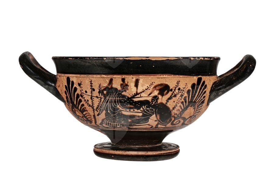Cup-skyphos attica a figure nere priva di colori aggiunti ma con graffito. Lato A e B: La dea Atena stante, con himation e chitone, indossa elmo attico e regge la lancia e lo scudo con cui incalza il gigante che giace a terra in ginocchio e si poggia su uno scudo concavo; è nudo e indossa un elmo attico. Ai lati si vedono due cespugli con frutti.