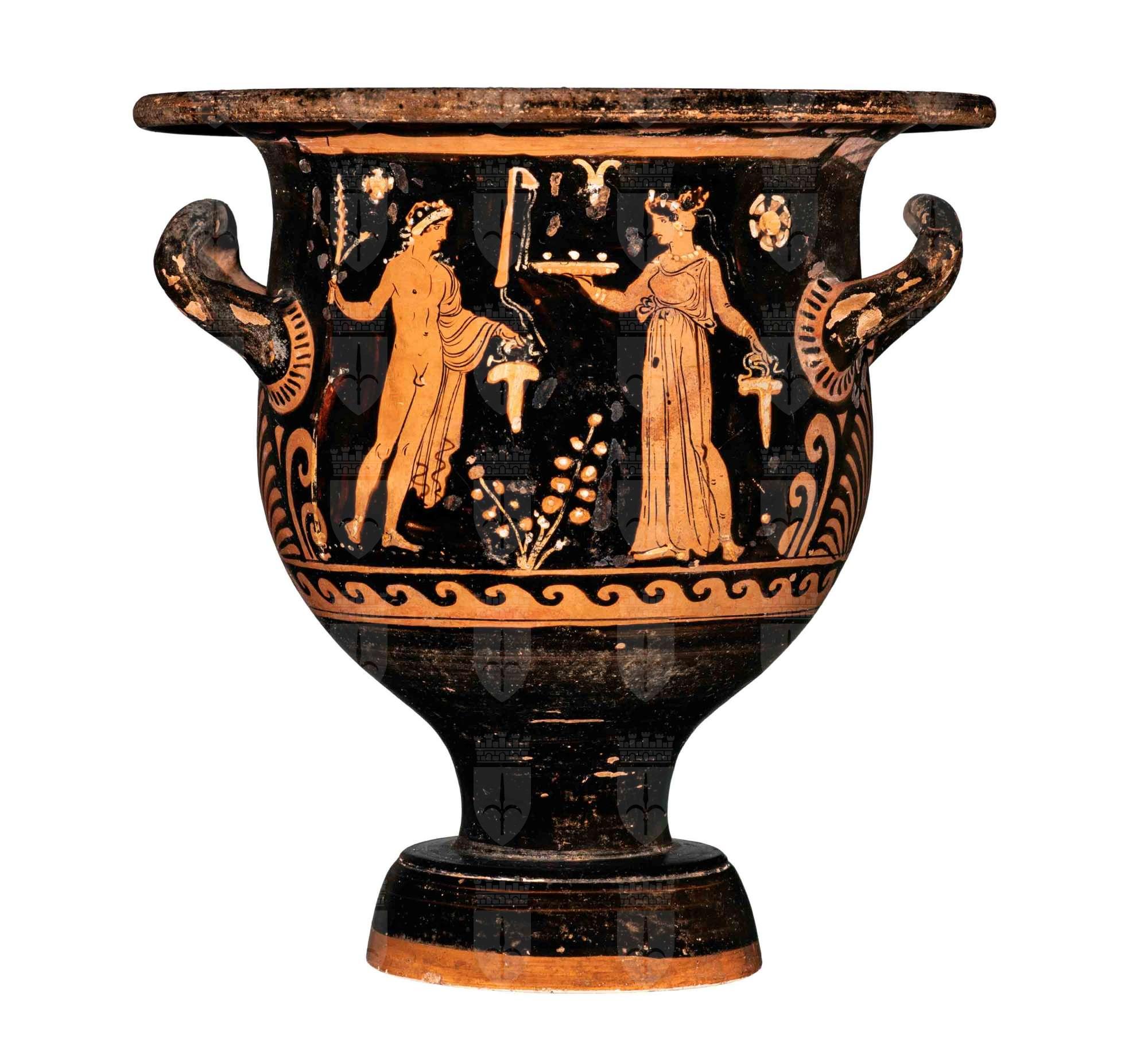 Cratere a campana apulo a figure rosse; fascia con serto di alloro sotto il labbro e ad onda marina sotto le scene figurate. Lato A: giovane nudo con tirso e grappolo; fanciulla con grappolo e patera; albero. Lato B: due giovani ammantati con bastone.