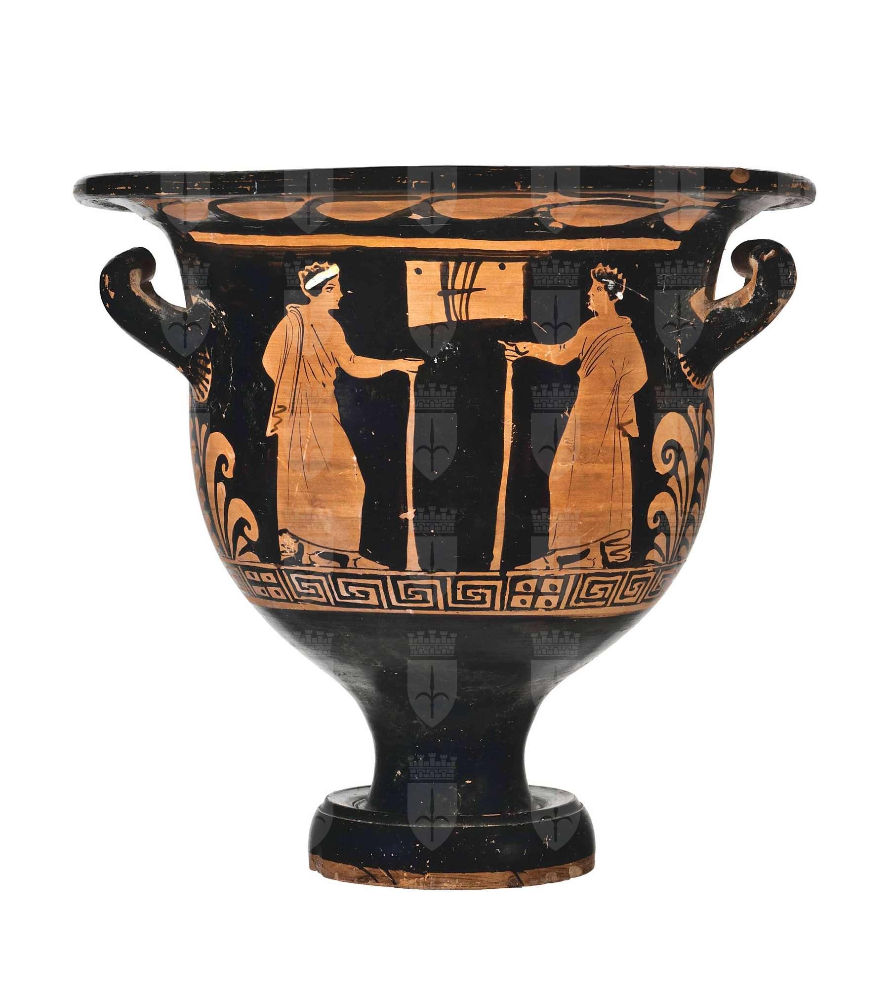 Cratere a campana. Orlo estroflesso, distinto dalla vasca da una lieve mondatura evidente al tatto; labbro arrotondato, a sua volta distinto dall'orlo da una sottile mondatura a cavetto. Anse a sezione circolare impostate orizzontalmente e rialzate; piede ad echino cavo, incavato all'attacco con lo stelo e modanato alla sommità Lato A: Eros seduto con fiaccola e menade stante. Eros seduto di tre quarti verso sinistra su roccia sovradipinta in bianco e giallo con infiorescenze sulla base; regge nella mano destra sollevata una fiaccola accesa ( con fiamma evanida), mentre la mano sinistra poggia sulla seduta.Il dio è nudo e indossa calzari chiusi con dettagli sovradipinti sul collo del piede e sui calcagni. Nelle ali il piumaggio è decorato con punti e tratti sovradipinti. Sulla sinistra, menade stante vestita con un chitone stretto in vita. I piedi sono calzati con delle basse embades, la chioma raccolta in una mitra, con nastri bianchi sovradipinti. Le braccia sono allargate e sul palmo della mano sorregge una phialè decorata presso l'orlo e sulla breve vasca rispettivamente da una linea metopale risparmiata di spessore irregolare, grappolo d'uva con tralcio e foglia nastri. Sempre nella mano sinistra regge una ghirlanda, costituita da una fila di tre rosette sovrapposte a sei petali con bottone centrale, da cui si dipartono tre rami; due, resi con file di puntini, sovradipinti in bianco e giallo con infiorescenze. Nel campo, in alto a destra finestra strombata profilata in bianco. Lato B: Due giovani ammantati a colloquio. Ambedue appoggiati al bastone, sono stanti, di profilo e affrontati. Entrambi hanno la testa cinta da una benda sovradipinta in bianco e indossano un himation bordato e drappeggiato trasversalmente che lascia spalle e braccia destro scoperte e forma un fascio di pieghe parallele intorno al busto.