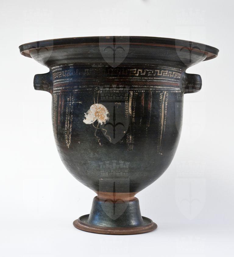Cratere a campana con maschera a vernice nera con sovraddipinture in bianco crema, giallo ocra e rosso amaranto. Labbro revoluto modanato, orlo estroflesso, vasca profonda, anse a nastro, impostate orizzontalmente sotto l’orlo, gola di raccordo, alto piede campanulato. A: Sotto l’orlo, tra le coppie di linee dipinte in bianco, meandro in giallo su base bianca, fascia in rosso amaranto; segue, infine, una fila di punti, sempre in giallo su base bianca. Sul corpo tra due coppie di rami secchi con foglie a trattini, che inquadrano due tenie in rosso amaranto, maschera teatrale di profilo verso sinistra dipinta in bianco e giallo, tra due foglie ad Y. B: Ramo di ulivo selvatico stilizzato senza bacche.