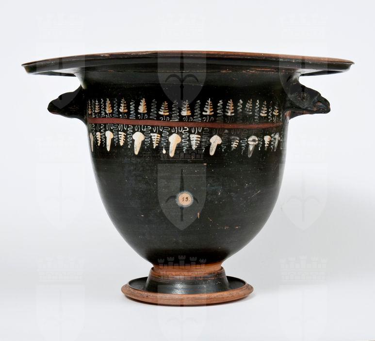 Labbro espanso e revoluto modanato, orlo estroflesso, profonda vasca ovoidale, con prese a protome leonina ben modellate, bassa gola di raccordo, piede campanulato Lato A: tralcio di vite, con stelo ln rosso amaranto, grappoli, pampini, viticci e germogli in bianco e giallo.