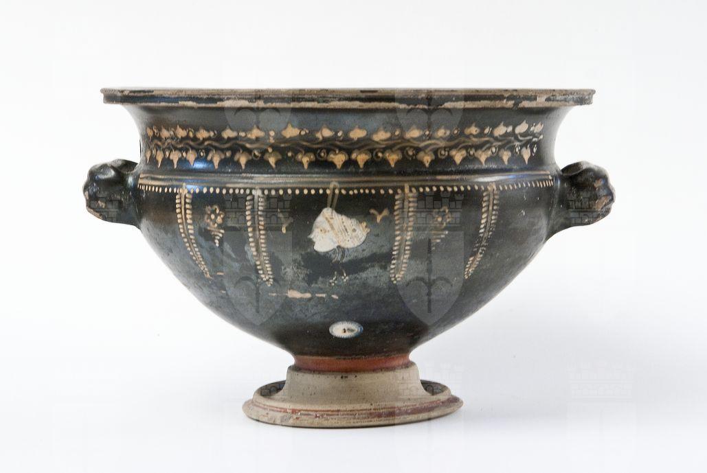 Zuppiera con maschera teatrale a vernice nera, tendente al rosso, con sovraddipinture in bianco crema e giallo oro. Orlo estroflesso modanato, ampia vasca, prese a nastro tricostolate, bassa gola di raccordo, piede campanulato. Lato A: Sotto l'orlo tralcio di edera con stelo sinuoso dipinto e girali con punti in giallo. Sul corpo coppia di linee dipinte e fila di punti, da cui pendono quattro rami secchi con foglie a trattini, che inquadrano, al centro, una maschera teatrale femminile con sakkos, dipinta in bianco con dettagli in giallo oro, di profilo verso sinistra, e tra due foglie a Y, ai lati due rosette su serie di linee digradanti. Lato B: Sotto l'orlo, ramo secco con foglie puntiformi in giallo oro.