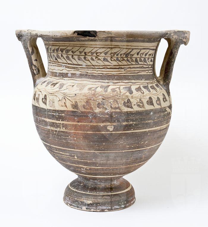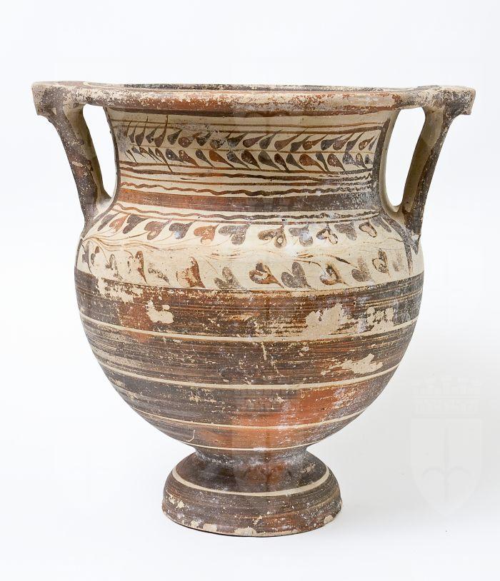 Cratere a colonnette tornito a fasce e di stile misto. Orlo a fascia e modanatura concava, nel quale confluiscono, tramite la piastra, le anse a colonnette; collo cilindrico a profilo concavo, corpo ovoidale con spalla tondeggiante, piede a echino. Decorazione a vernice monocroma rossa e brunastra su fondo naturale di argilla, con ramo d’ulivo e linee ondulate sul collo e un fregio di foglie d’edera sulla spalla, con ampie fasce parallele interamente campite a vernice rossastra sul ventre; campitura rossastra nell’orlo, nelle anse e nel piede.