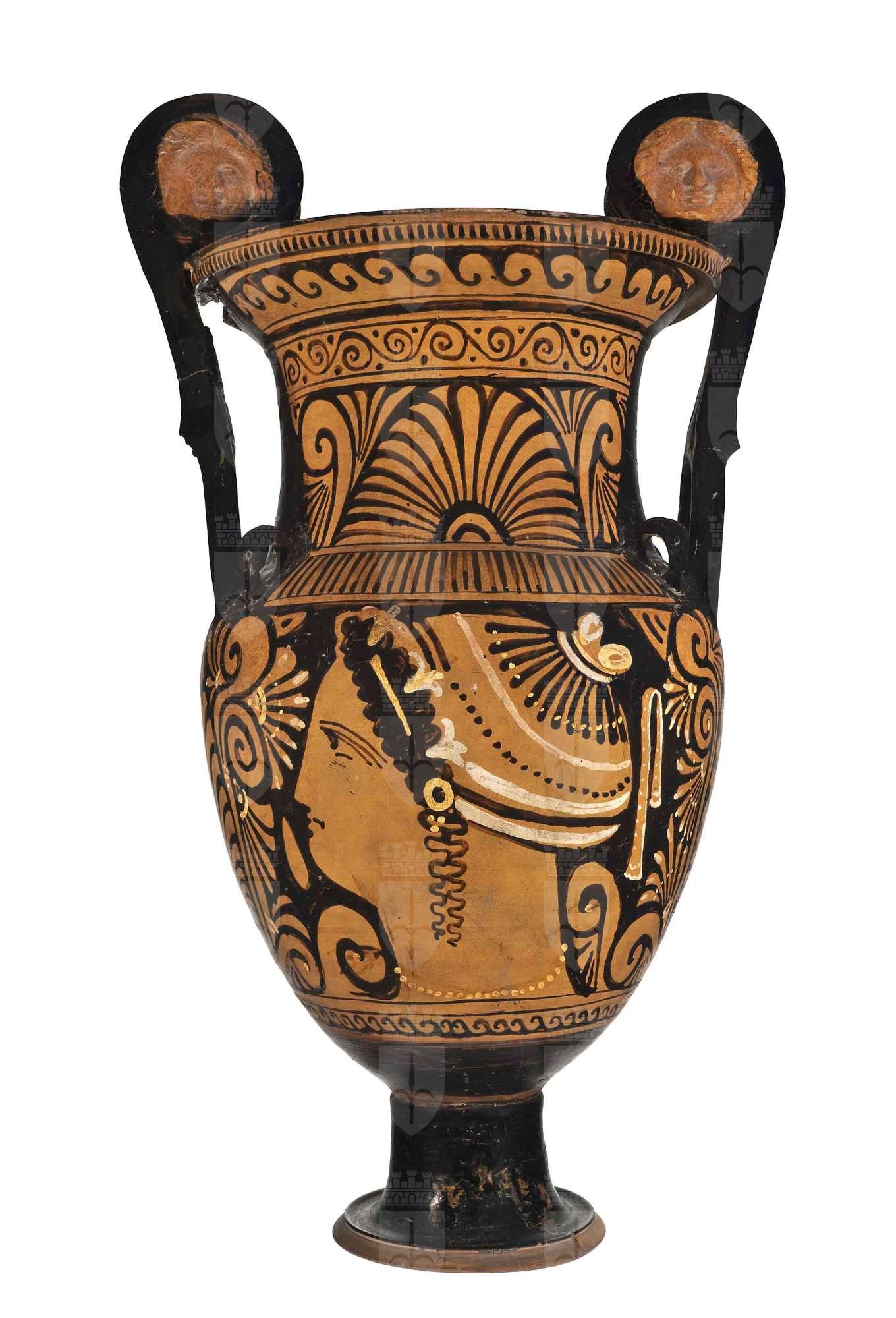 Cratere a volute con mascheroni apulo a figure rosse. Lato A: guerriero eroicizzato; Lato B: testa femminile