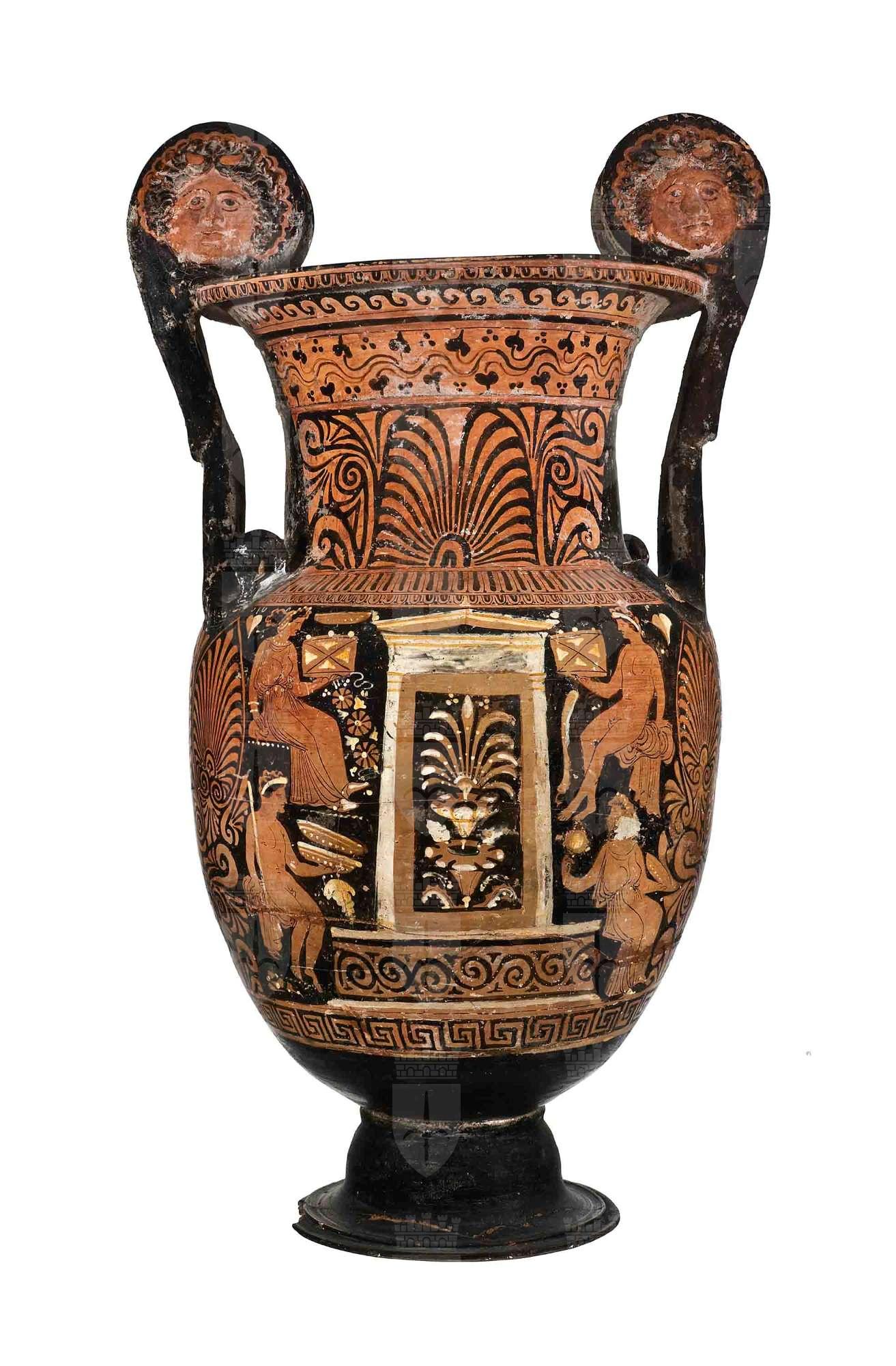 Cratere a volute con mascheroni con anse terminanti a teste di cigno; apulo a figure rosse. Lato A: defunto eroicizzato: su un basamento modanato, in un'edicola frontale, sta un giovane guerriero stante e tiene alla briglia un cavallo; ai lati quattro offerenti seduti rivolti al centro. Lato B: al centro un'edicola contenente due fiori campanulati sovrapposti e palmetta; ai lati quattro offerenti seduti.