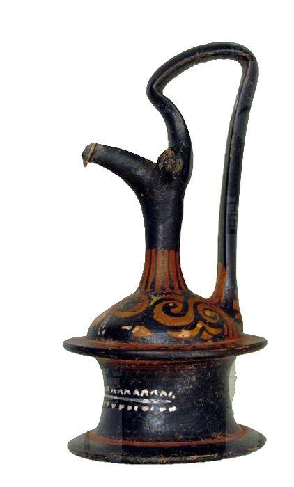 Labbro a becco semicilindrico molto allungato; collo a profilo concavo, distinto dalla spalla accentuatamente convessa. Corre, per la semicirconferenza anteriore del corpo a rocchetto un tralcio d’edera. Lato A: testa femminile con stephanè Testa femminile di profilo rivolta verso sinistra; fronte e naso costituiti da un’unica linea continua diritta; occhio con dettaglio di sopracciglio, palpebra, rima superiore e inferiore aperte e pupilla pendente dalla rima superiore. La narice lasciata non caratterizzata; labbro superiore e inferiore distinti per mezzo di un breve tratto a vernice nera appena tendente verso il basso. I capelli ricci sono raccolti, eccetto per le ciocche che scendono lungo la tempia, in una mitra decorata da una corona di tratti a vernice nera presso l’apertura posteriore e, al centro, da una linea continua in bianco sovradipinto. Sul capo, una corona a bassi raggi, in giallo sovradipinto. Sempre in giallo, anche gli orecchini di forma pseudo-triangolare con tre grani accostati e il girocollo ad unico filo di vaghi.