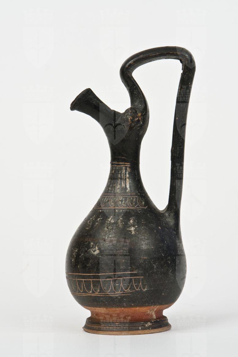 Epichysis globulare a vernice nera con sovraddipinture in bianco giallo e rosso amaranto ed incisioni. Bocchello a labbro revoluto, collo cilindrico, corpo piriforme schiacciato in basso, ansa a nastro sormontante, gola di raccordo, piede troncoconico modanato al taglio. Sul collo: tra tre coppie di linee incise, bastoncelli, grappoli, pampini, viticci e germogli in bianco giallo. Alla base del corpo piriforme, motivo degli ovuli incisi e dipinti con punti tra due coppie di linee incise.