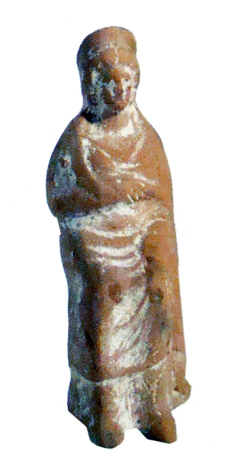 Statuina in terracotta realizzata a matrice. Cava. Presenta sul retro la scritta in nero "359" e in rosso "2709". Riporta l'etichetta con scritto "Rudiae Ostr. 255". Sulla basetta moderna lignea è apposta l'etichetta "2 (...)8". Non lavorata sul retro. Figura femminile seduta con veste con scollatura a V e piegoline a rendere il panneggio. . La figura indossa un hymation che copre un lungo chitone drappeggiato terminante ai piedi con delle scarpe realizzate a punta. Il capo è cinto da un polos e in viso porta due pendenti circolari. Velata e con mantello che le avvolge il lato sinistro del corpo. Anche la mano appoggiata sul ginocchio è coperta. Il braccio destro è invece piegato ad angolo retto sul petto e la mano tiene stretto un lembo del mantello. Del volto ben visibili occhi, naso e bocca.