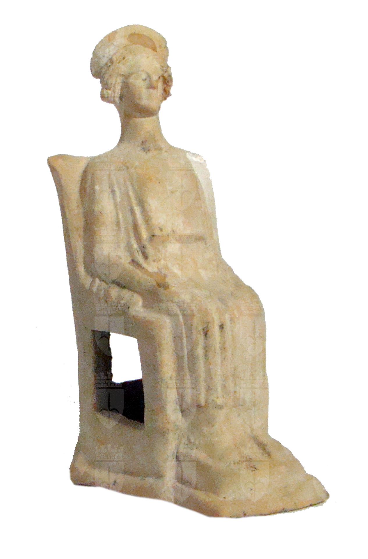 Figurina femminile in terracotta, realizzata a matrice. Cava. Cavità rettangolare sul retro. Sulla base è apposta un'etichetta con la cifra "628". Sul retro è presente un'etichetta ovale con la dicitura "28 Febbr. 74 Baldini GRECIA", apposta su precedente etichetta rettangolare. Visibile la scritta in rosso "5123=628". Retro non lavorato. Figura femminile, assisa su trono con alto schienale. Vestita di un peplo. Le braccia sono poste sulle ginocchia e le mani stringono dei fiori. La testa è più piccola rispetto al collo lungo. Capigliatura con scriminatura centrale, riccioli, e polos cilindrico svasato.
