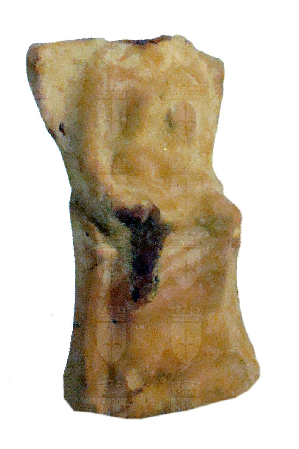 Statuina in terracotta, realizzata a matrice. Cava. Segni di bruciatura lungo la gamba destra. Cavità ovale sul dorso. Retro non lavorato. Presenta un'etichetta con la scritta "633" e un'etichetta ovale con la dicitura "31 Ott. 74. Museo Zoologico GRECIA". Figura femminile seduta su trono con alto schienale e piedistallo quadrangolare. Braccioli appena accennati. Non è leggibile il tipo di abbigliamento di cui si intuisce appena una scollatura a V e forse un mantello. Sulle ginocchia è posato un piccolo quadrupede, forse un cane. Il braccio destro è teso in avanti a reggere una patera.