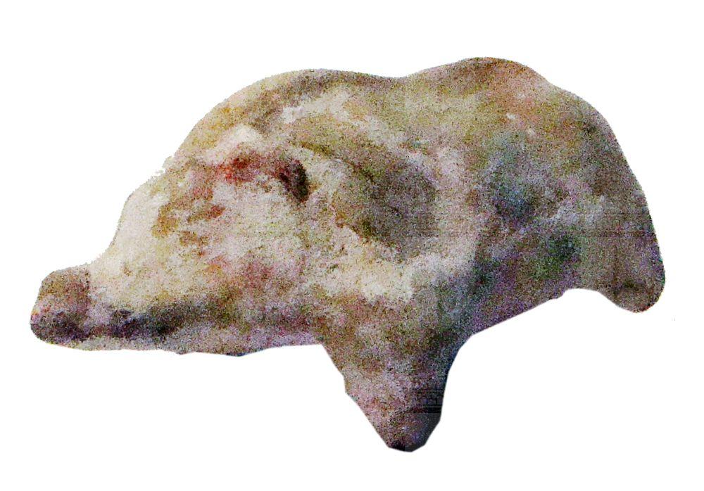 piccola figura di maiale realizzata in due metà con interno cavo per contenere il nucleo. La resa semplificata sottolinea l'aspetto selvatico dell'animale dal dorso irto, piccole orecchie, grugno a bottone e quattro zampe stilizzate di cui una mancante.