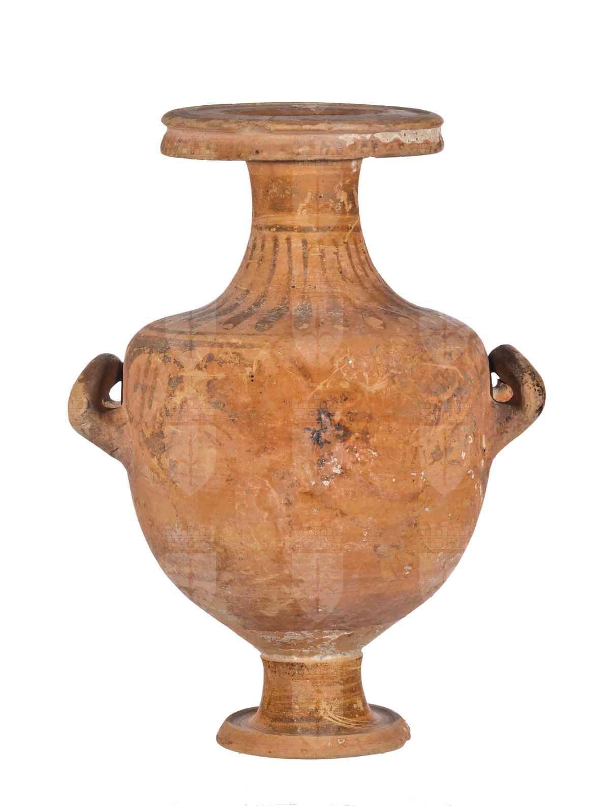 Argilla rosata (Munsell 7.5 YR), vernice totalmente abrasa, con le immagini sovraddipinte di difficile o impossibile lettura. Il vaso presenta una stretta imboccatura con orlo fortemente estroflesso distinto e labbro modanato; il corpo globulare, ma rastremato verso il fondo, poggia su un piede a disco dal profilo troncoconico con alto stelo. Il vaso presenta due anse a bastoncello, impostate orizzontalmente e tanto ripiegate da toccare il corpo del vaso. La terza ansa, sempre a bastoncello, è verticale e impostata tra orlo e spalla. Purtroppo la decorazione, vista la forte abrasione della vernice, appare quasi del tutto corrotta e difficilmente decifrabile. Si può notare tuttavia un elemento della decorazione accessoria, costituito da una fascia decorata a baccellatura nello spazio compreso tra collo e spalla. Dal momento che la forma non trova confronti con la ceramica lucana, resta dubbio l'inserimento di questo vaso in tale categoria. Sul vaso sono presenti diverse etichette: una sul piede, con indicazione del numero '74'; in prossimità della scritta 'dono Picotti | 3 12 1943 | 2288'. L'etichetta sembra posta su un'etichetta precedente, non più leggibile. Dall'altra parte dell'anello del piede si nota la scritta 'Arezzo', che compare anche su una seconda etichetta apposta presso l'ansa orizzontale destra, immediatamente sotto la spalla, forse ad indicare il luogo di acquisto o provenienza del reperto. Vi è infine una terza etichetta sull'orlo del vaso, sulla quale si legge la scritta '109'.
