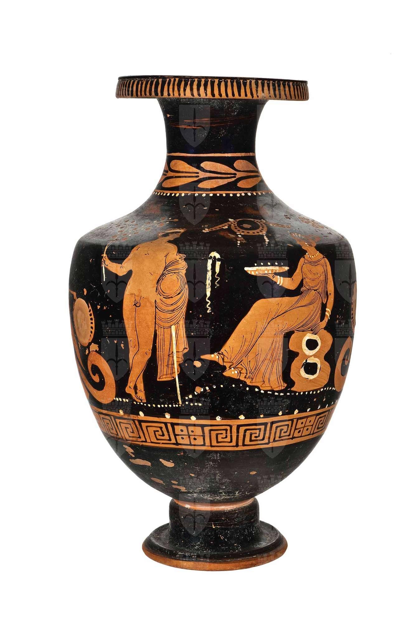 Hydria apula a figure rosse le cui due anse si sono staccate lasciando le cicatrici nel punto di adesione. Donna seduta con patera con offerte e giovane nudo con serto; elementi vegetali sotto l'ansa.