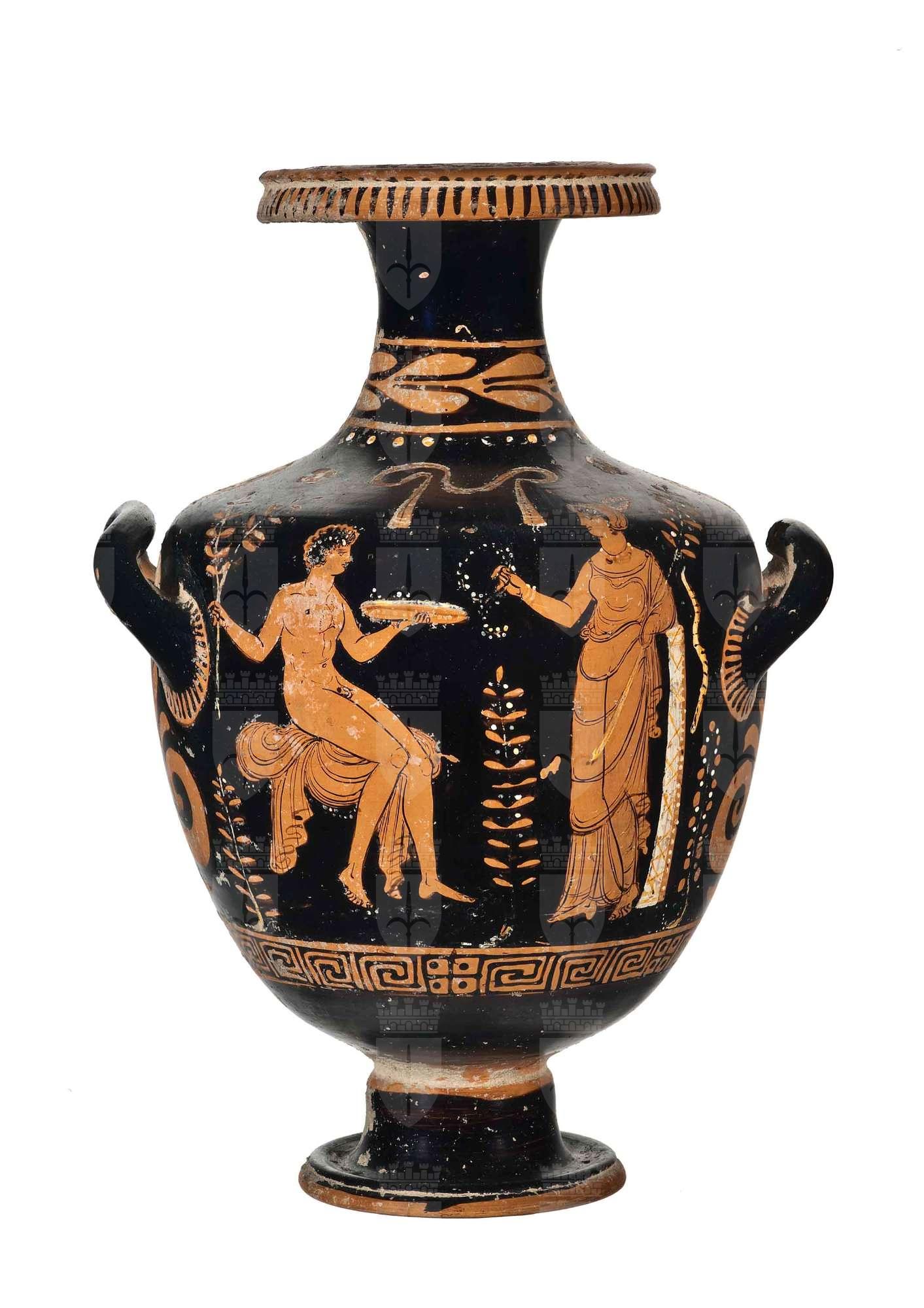Hydria apula a figure rosse con giovane nudo seduto con patera con offerte e serto d'alloro; donna stante poggiata a pilastro con serto d'alloro e vestita di chitone; benda sospesa sulla spalla, sotto l'ansa grande palmetta.